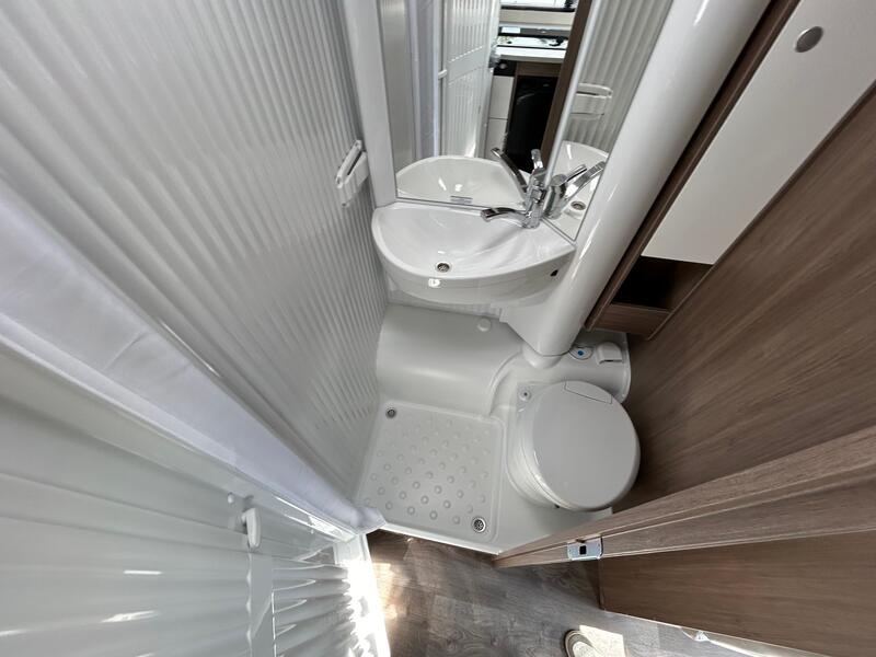 Options : jantes alu 16″ + transformation dinette en couchage (1 340 €), caillebotis de douche + 2ᵉ batterie cellule + précâblage panneau solaire (755 €).