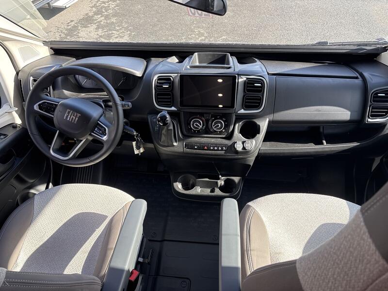 Finition Ultimate LineChâssis blanc, Climatisation manuelle de cabine, Double airbag, Fix and go, Sièges de cabine pivotants réglables en hauteur avec double accoudoir, Housses de sièges cabine assorties à l’ambiance cellule, Rétroviseurs électriques dégivrants, Régulateur / limiteur de vitesse, ESP, Traction +, Hill descent control, Eco pack FIAT : Stop&Start, alternateur intelligent, pompe à carburant à gestion électronique, Isolation marche d’entrée, Toit panoramique cabine ouvrant, Lanterneau panoramique (ou double lanterneau), Rideaux de séparation cabine/cellule, Fenêtres double-vitrage avec combiné stores moustiquaire, Voilages, Charnières placards amorties, Prises USB/USB-C, Conception IRP : toit plancher parois polyester, Technibox, Pare-chocs avant peint, Jantes acier avec enjoliveurs 15” gris, Pneus 4 saisons, Feux antibrouillard, Porte d’entrée avec fermeture centralisée porteur cellule, Pré-équipement TV, Chauffage sur carburant utilisable en roulant, Eclairage d’auvent, Penderie, Pré-disposition panneau solaire (MPPT ready), Précâblage caméra de recul, Fixations Isofix + Pack Connect : Caméra de recul, Système multimédia, Commandes au volant, Antenne Radio DAB : 0 €