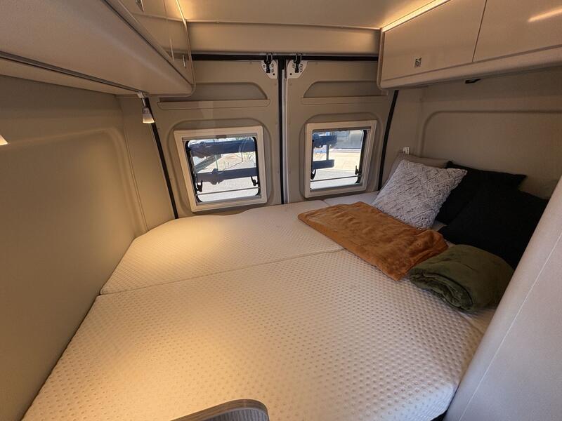 Le fourgon est équipé d’un lit transversal à l’arrière pouvant accueillir deux adultes confortablement. Sa position facilite l’accès aux zones de rangement situées dessous.