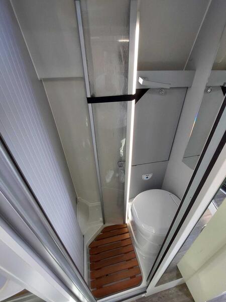 Une salle d’eau compacte avec douche et toilette cassette pour rester autonome où que vous alliez.